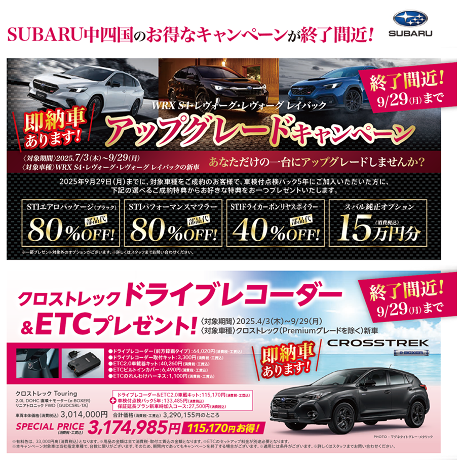 アップグレードキャンペーンやクロストレック ドライブレコーダー&ETCプレゼントなど