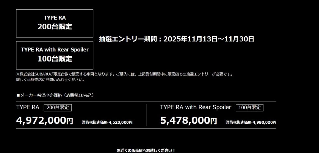 SUBARU BRZ STI Sport TYPE RA の抽選は11月30日(日)までとなっております。