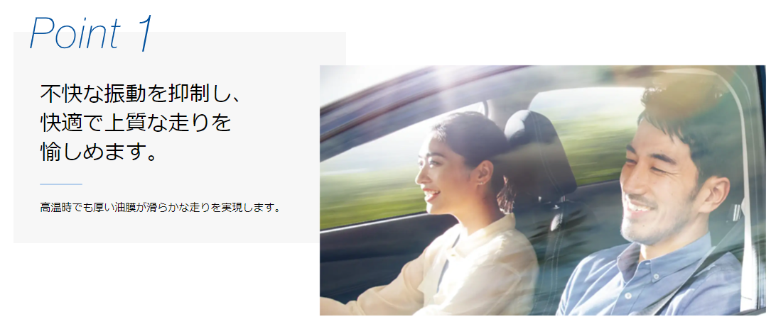 高いクッション性能を持つ厚い油膜が、振動や騒音を抑えます。車内が静かになるので、ドライブ中の音楽や会話をよりクリアに愉しめます。