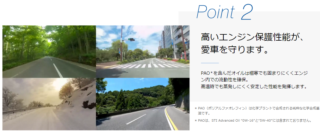 特にSTI Advanced Oilの中でも低粘度な「0W-16」は、温度が低くてもサラサラとした軟らかい状態を維持できるという特徴を持っています。つまり、エンジンが冷えている状態からでもオイルが素早くエンジン全体に行き渡り、保護性能を発揮できるということ。ちょい乗りが多い方は勿論、寒冷地にお住いのお客様にもおすすめです!